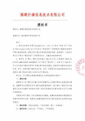 福建mg冰球突破信息技术有限公司注册地位于福建省福州市,是国内《热血传奇》客户端游戏独占性版权人。对《热血传奇》客户端游戏拥有全部版权,并有权基于版权权利进行该游戏维权。株式会社传奇IP (以下简称传奇IP )对《The Legend of Mir 2》(中文名为“热血传奇"、或“传奇”、“传奇2”、“MIR II”)游戏(以下称为 “授权作品”) 共同享有充分、完整且有效的著作权。经传奇IP授权 , RENAISSANCE INVESTMENT MANAGEMENT LIMITED (以下简称 RENAISSANCE Ltd.)有权在中国大陆地区独占性地对授权作品的网络客户端游戏进行开发、 发行、管理、宣传、推广和运营,针对授权作品的侵权游戏及侵权方,RENAISSANCE Ltd.有权采取必要的措施,并有权将前述权利分授权给第三人。福建mg冰球突破信息技术有限公司经RENAISSANCE Ltd.授权,获得上述权利,有权在中国大陆地区独占性地对授权作品的网络客户端游戏进行开发、发行、管理、宣传、推广和运营,并有权对侵权行为/主体采取维权措施。