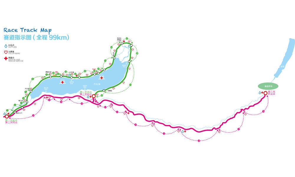 賽道指示圖 賽道全程99公里,87%為山地越野賽道,含林道、山路、砂石和草甸路面;12%為公路賽道。