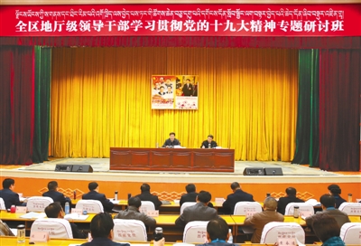 為落實(shí)黨中央要求,推動(dòng)地廳級(jí)領(lǐng)導(dǎo)干部深入學(xué)習(xí)領(lǐng)會(huì)黨的十九大精神,更加準(zhǔn)確把握區(qū)黨委九屆三次全會(huì)部署要求,帶動(dòng)全區(qū)廣大干部群眾貫徹落實(shí)到位,推動(dòng)黨的十九大精神落地生根,20日上午,自治區(qū)黨委舉行全區(qū)地廳級(jí)領(lǐng)導(dǎo)干部學(xué)習(xí)貫徹黨的十九大精神專題研討班開班式。