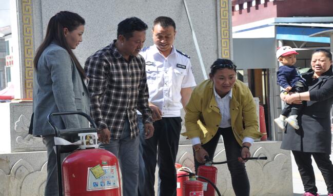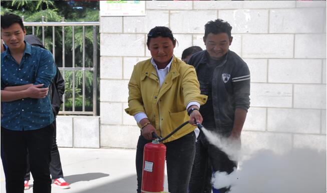(2)手提式干粉滅火器:主要由壓把、保險(xiǎn)銷、筒身、噴管等組成。使用手提式干粉滅火器,應(yīng)在距燃燒物3—5米處左右進(jìn)行,操作者應(yīng)先將滅火器上下?lián)u晃后將開啟壓把上的保險(xiǎn)銷撥掉,然后一只手握住噴射軟管前噴嘴根部,另一只手將開啟把下壓,迅速對(duì)準(zhǔn)火焰根部噴出干粉滅火。滅火時(shí)要迅速?gòu)氐?,不要遺留殘火,以防復(fù)燃。滅油料火時(shí)不要沖擊液面,以防液體濺出,給滅火帶來困難。