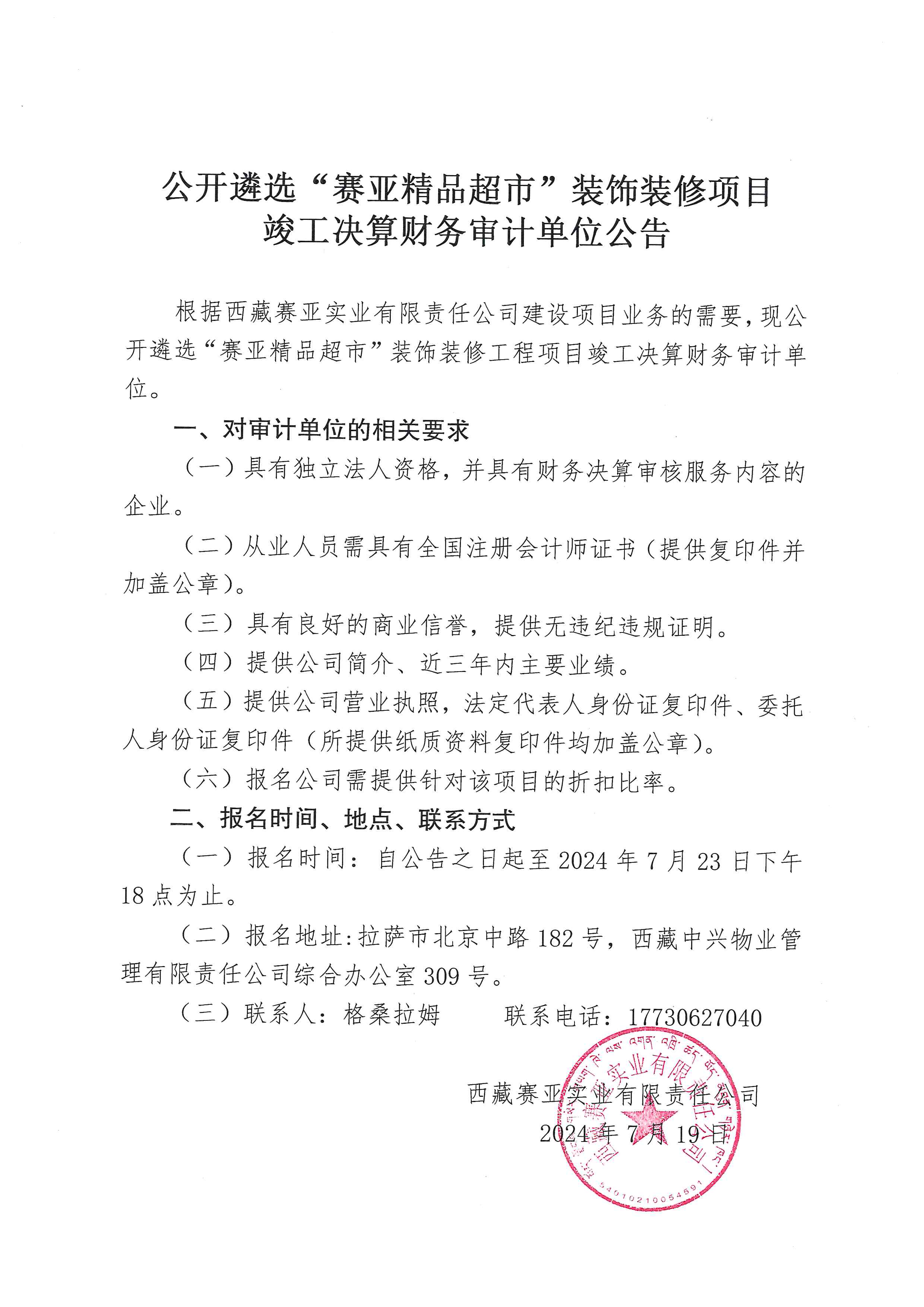 公開遴選“賽亞精品超市”裝飾裝修項(xiàng)目竣工決算財(cái)務(wù)審計(jì)單位公告