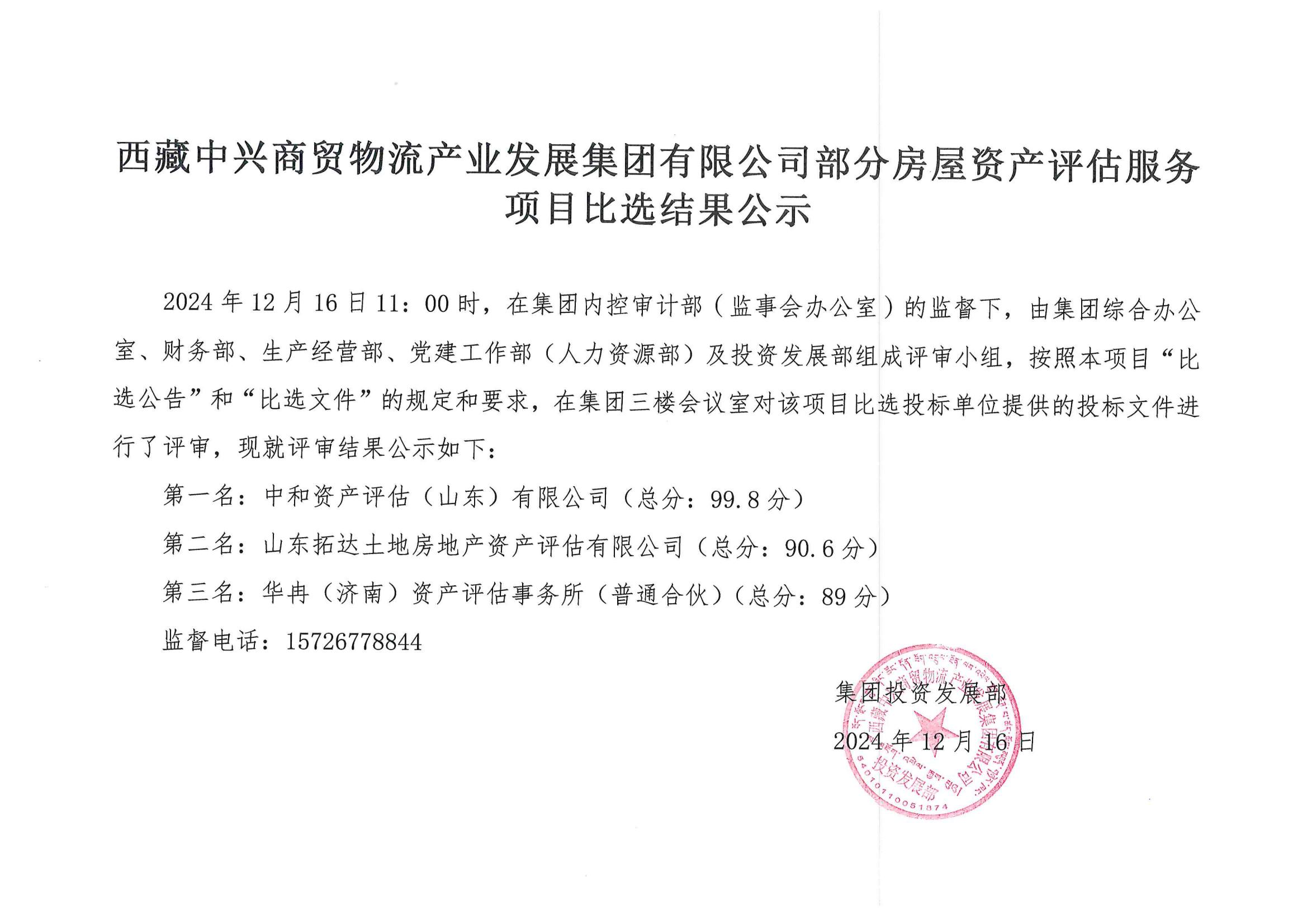 西藏中興商貿(mào)物流產(chǎn)業(yè)發(fā)展集團(tuán)有限公司部分房屋資產(chǎn)評(píng)估服務(wù)項(xiàng)目比選結(jié)果公示