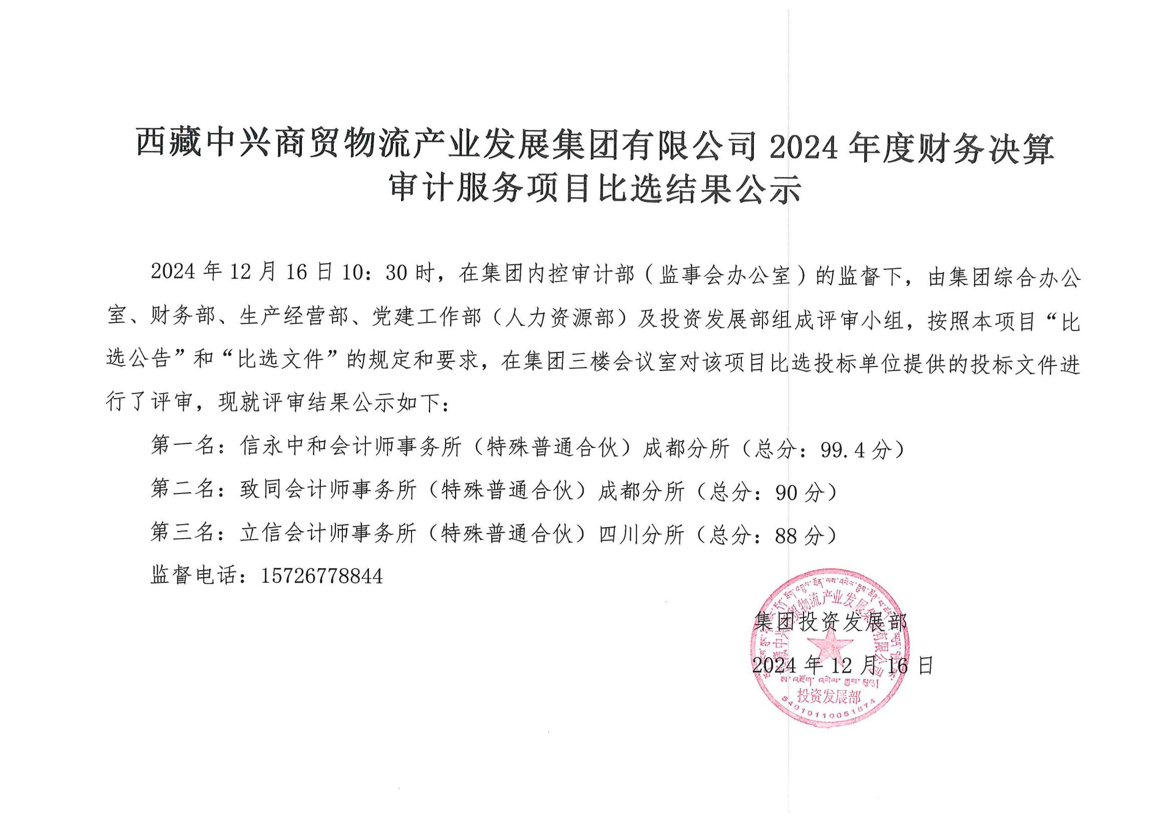 西藏中興商貿(mào)物流產(chǎn)業(yè)發(fā)展集團有限公司2024年度財務決算審計服務項目比選結(jié)果公示