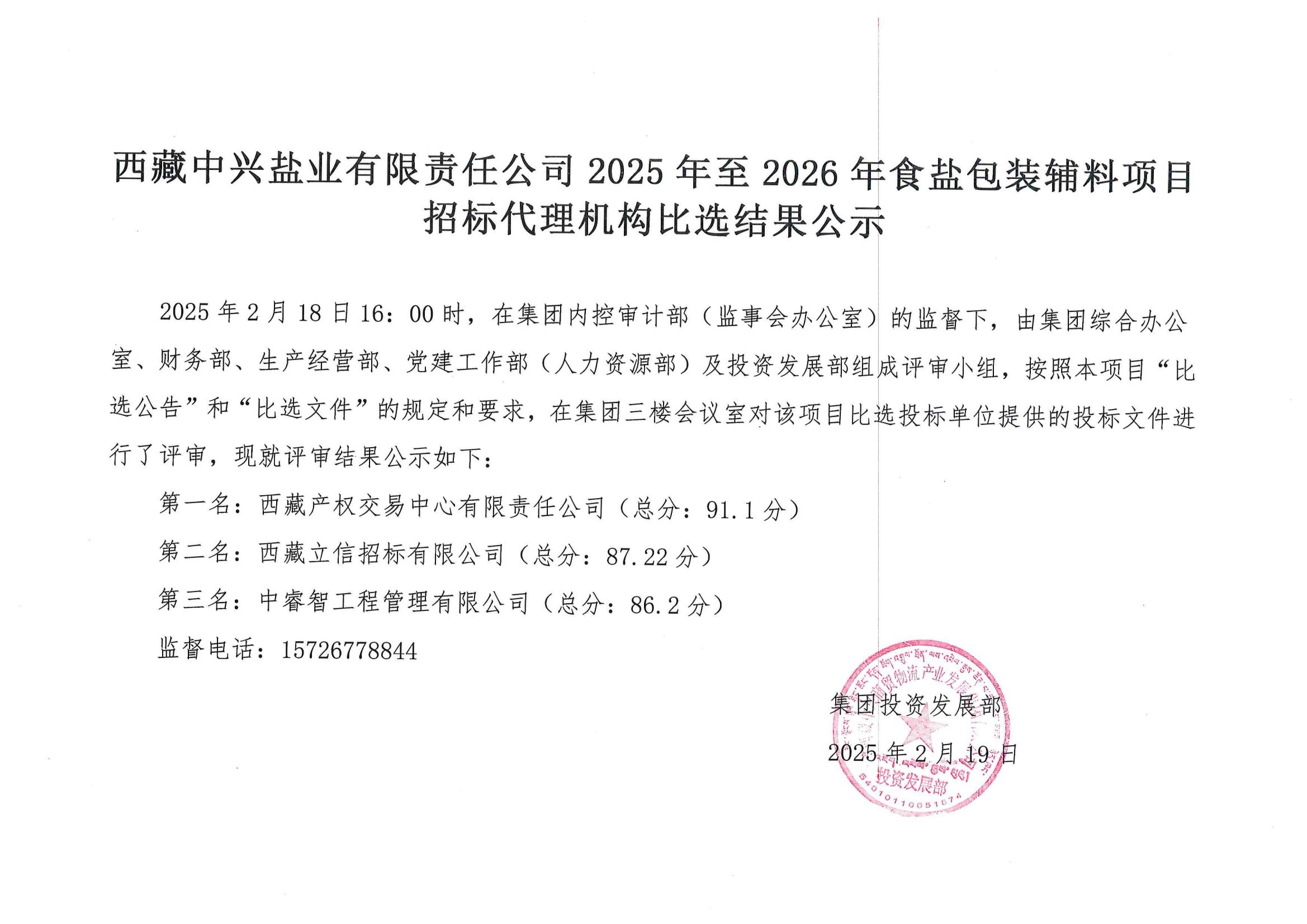 西藏中興鹽業(yè)有限責(zé)任公司2025年至2026年食鹽包裝輔料項(xiàng)目招標(biāo)代理機(jī)構(gòu)比選結(jié)果公示