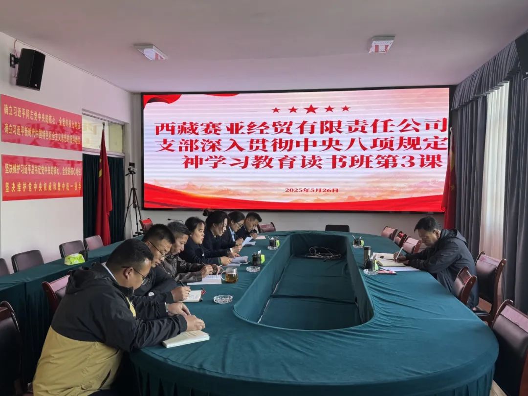 ???????????????????????????????????????????????????????????????????????????2025年5月26日下午,西藏賽亞經(jīng)貿(mào)有限責(zé)任公司黨支部組織開展中央八項規(guī)定精神學(xué)習(xí)教育讀書班第3課。會議由黨支部書記、董事熊衛(wèi)星主持,公司在家領(lǐng)導(dǎo)班子成員、各部門負(fù)責(zé)人及部分職工代表參加會議,旨在深入貫徹中央八項規(guī)定精神,強化作風(fēng)建設(shè),提升全體人員政治素養(yǎng)與業(yè)務(wù)能力。