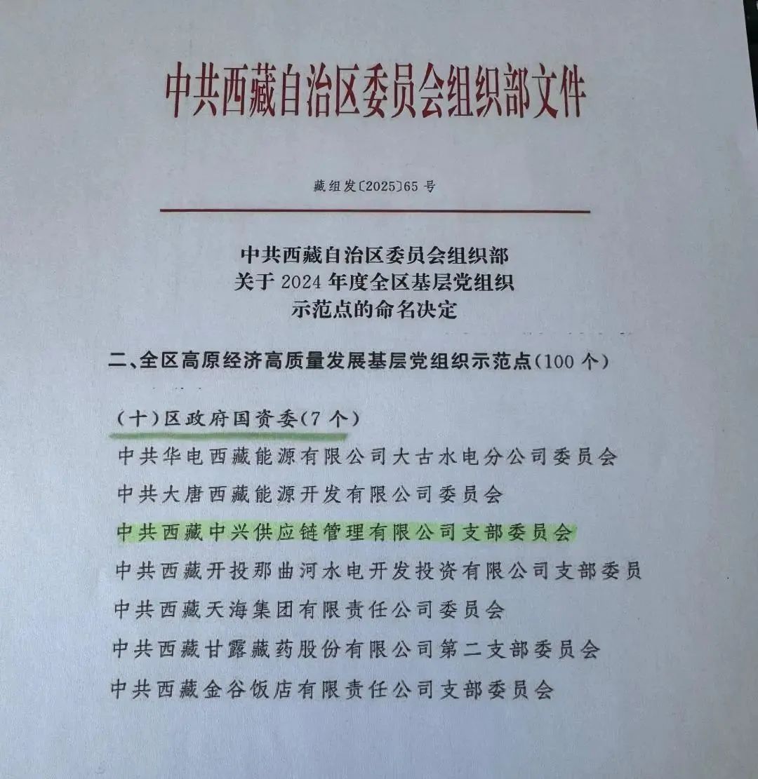 ???????????????????????????????????????????????????????????????????????????根據(jù)《中共西藏自治區(qū)委員會組織部關(guān)于2024年度全區(qū)基層黨組織示范點的命名決定》藏組發(fā)〔2025〕65號文件,西藏中興供應(yīng)鏈黨支部榮獲“全區(qū)高原經(jīng)濟高質(zhì)量發(fā)展基層黨組織示范點”榮譽稱號。