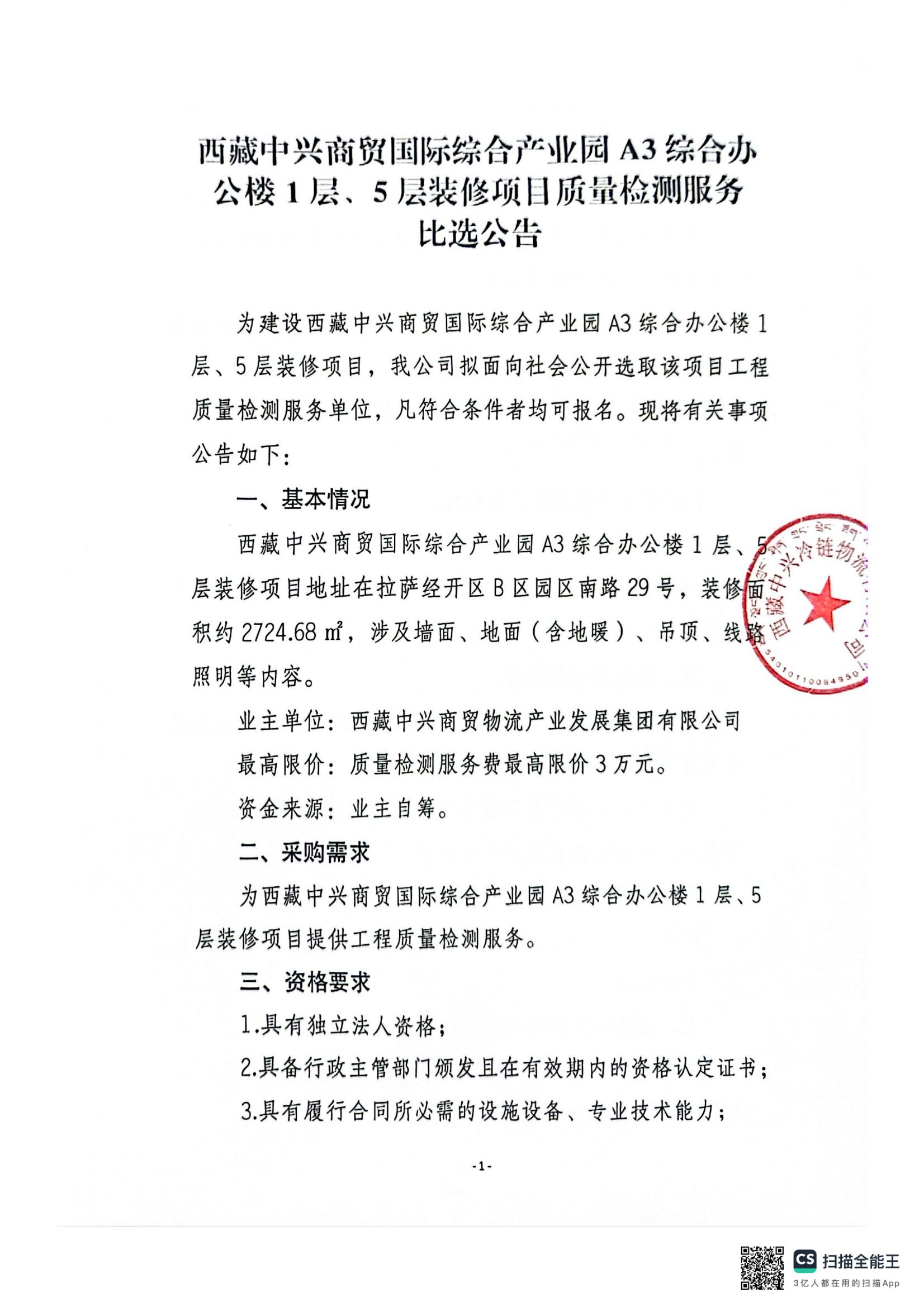 西藏中興商貿(mào)國際綜合產(chǎn)業(yè)園A3綜合辦公樓1層、5層裝修項目質(zhì)量檢測服務比選公告