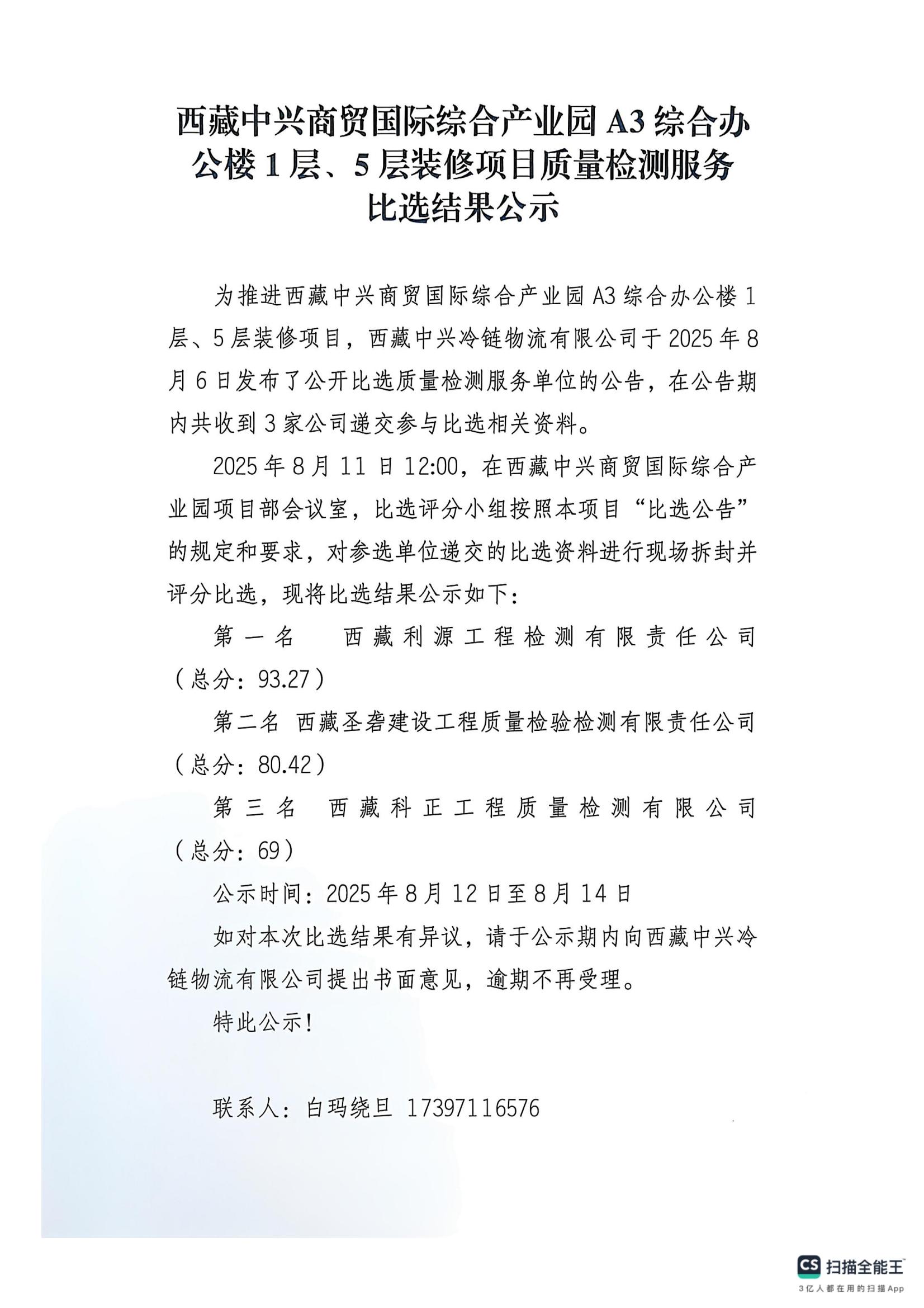 西藏中興商貿(mào)國際綜合產(chǎn)業(yè)園A3綜合辦公樓1層、5層裝修項(xiàng)目質(zhì)量檢測服務(wù)比選結(jié)果公示