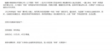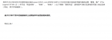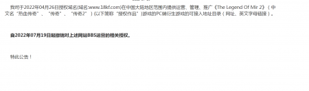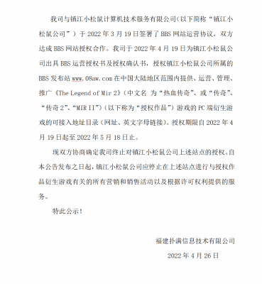 202204-26福建mg冰球突破信息技术有限公司(以下简称“我司”)自2021年获得《热血传奇》原始著作权人独占性授权,一直...