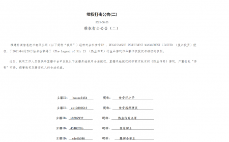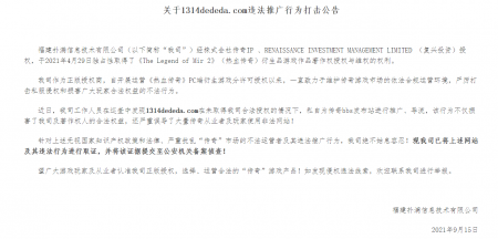 202108-30维权打击公告(二) 福建mg冰球突破信息技术有限公司(以下简称“我司”)经株式会社传奇IP 、RENAISSANCE INVESTMENT MANA...