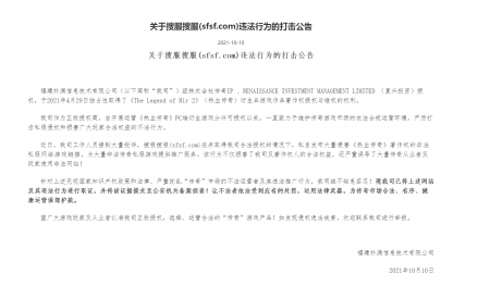 关于搜服搜服(sfsf.com)违法行为的打击公告 福建mg冰球突破信息技术有限公司(以下简称“我司”)经株式会社传奇IP 、RENAISSANCE...